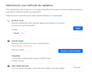 Cliquez sur « Ajoutez votre établissement sur Google » et suivez les instructions afin d’obtenir votre code de validation pour pouvoir gérer votre page GMB.