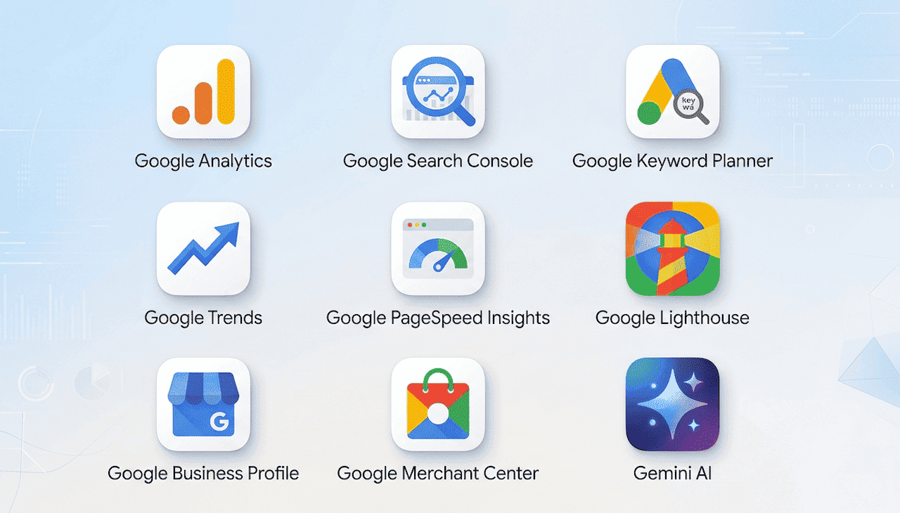 Google propose une douzaine d’outils SEO gratuits : Search Console, Google Analytics 4, Keyword Planner (via Ads), Google Trends, PageSpeed Insights, Lighthouse, Rich Results Test, Business Profile, Merchant Center, Gemini, NotebookLM, et l’AI Mode pour la veille. Les trois indispensables pour commencer sont Search Console, GA4 et Keyword Planner.